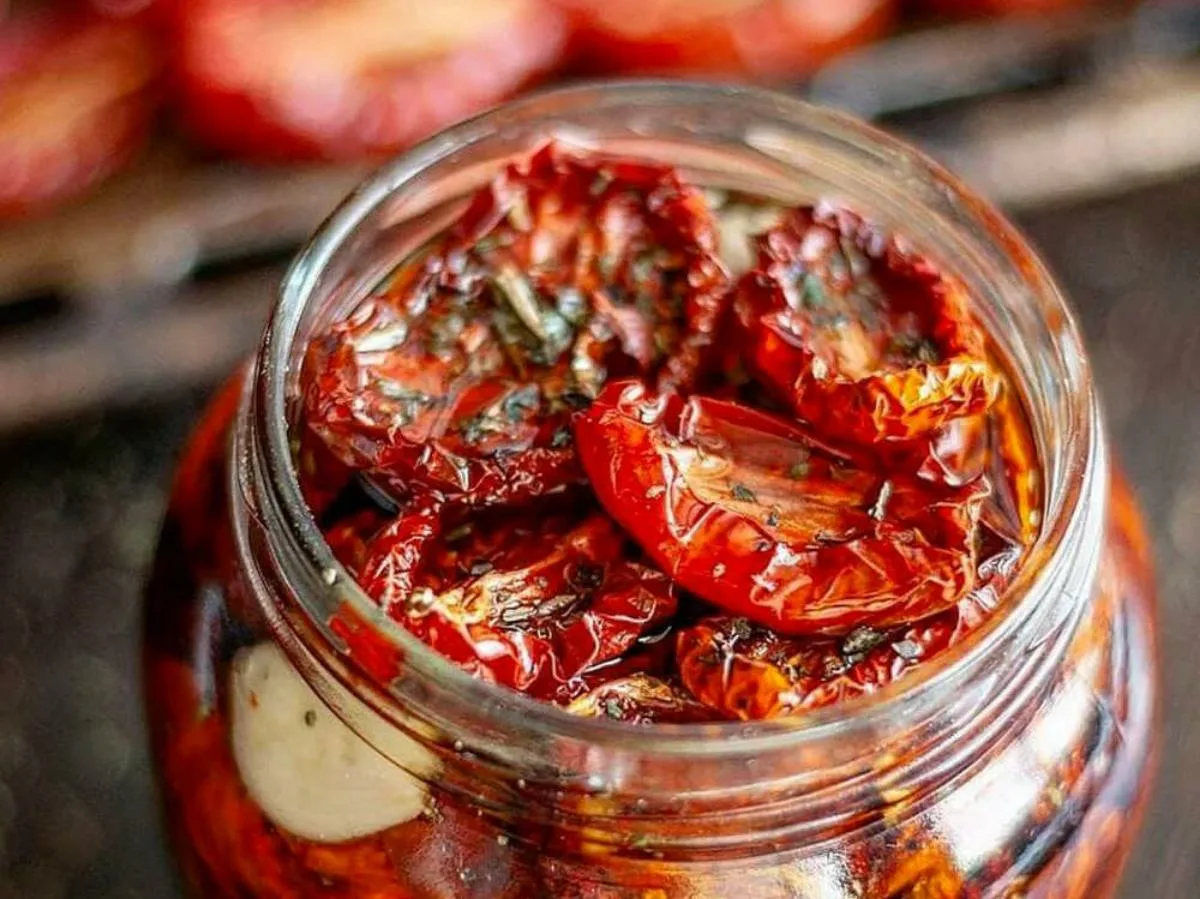 3. Viimeistele purkit: Steriloi purkit (250–300 ml). Lado kuivatut tomaatit purkkeihin kerroksittain, ripottele väleihin italialaisia yrttejä ja kaada jokaiseen purkkiin 1 rkl etikkaa. Kuumenna kasviöljy (ei kiehuvaksi!) ja kaada se purkkeihin, kunnes tomaatit peittyvät. Sulje kannet, käännä purkit ylösalaisin ja peitä pyyhkeellä, kunnes ne jäähtyvät.